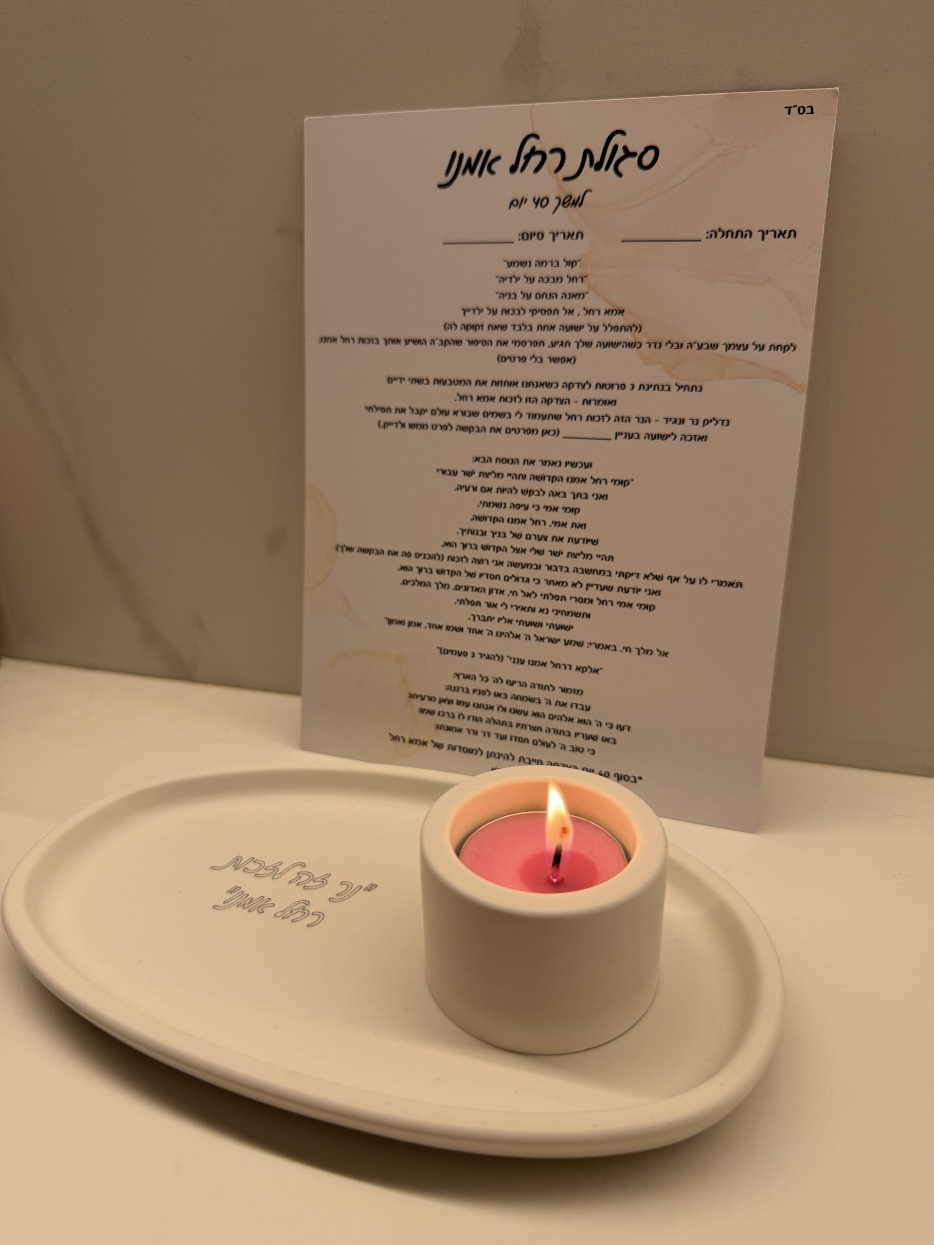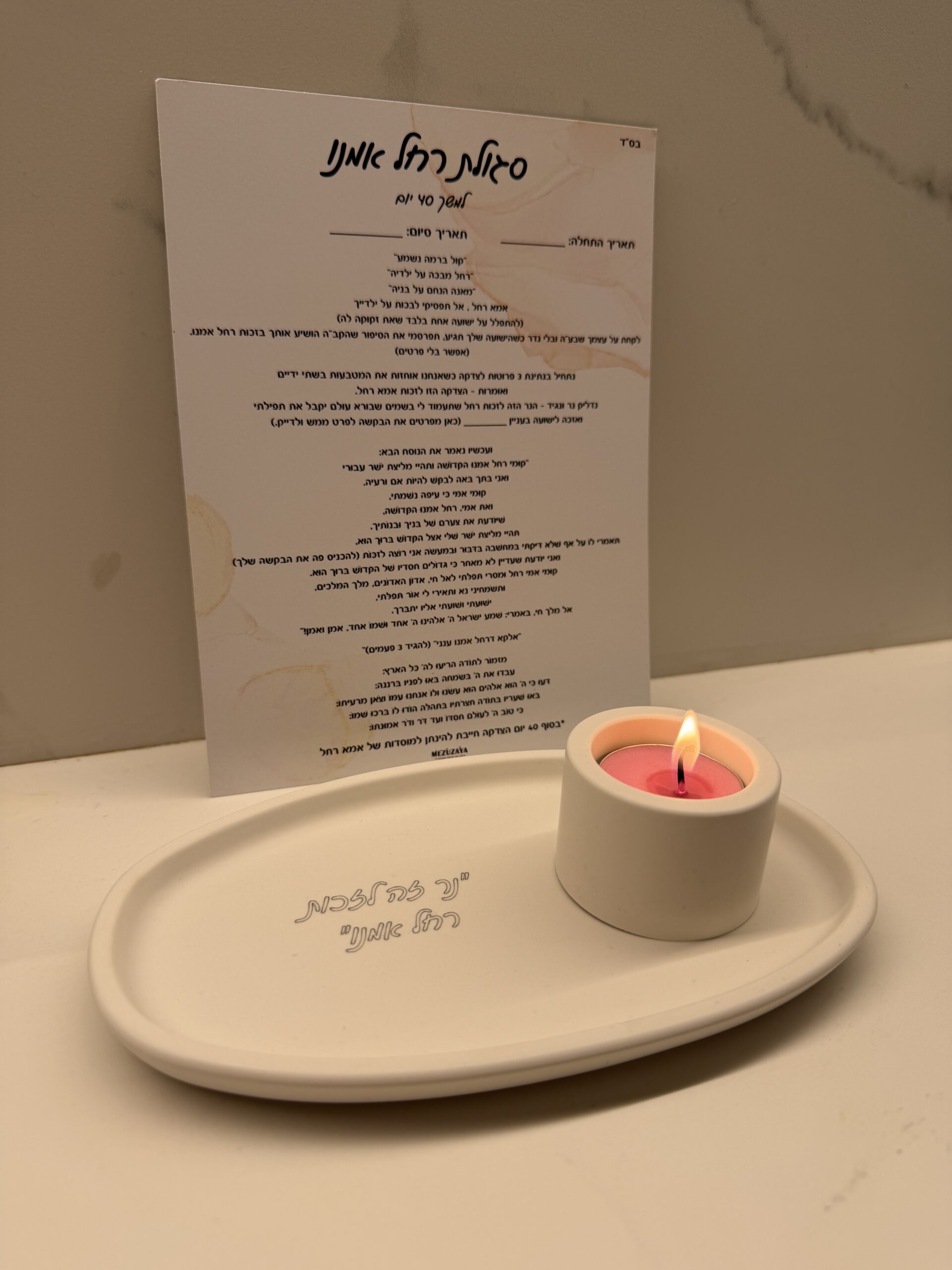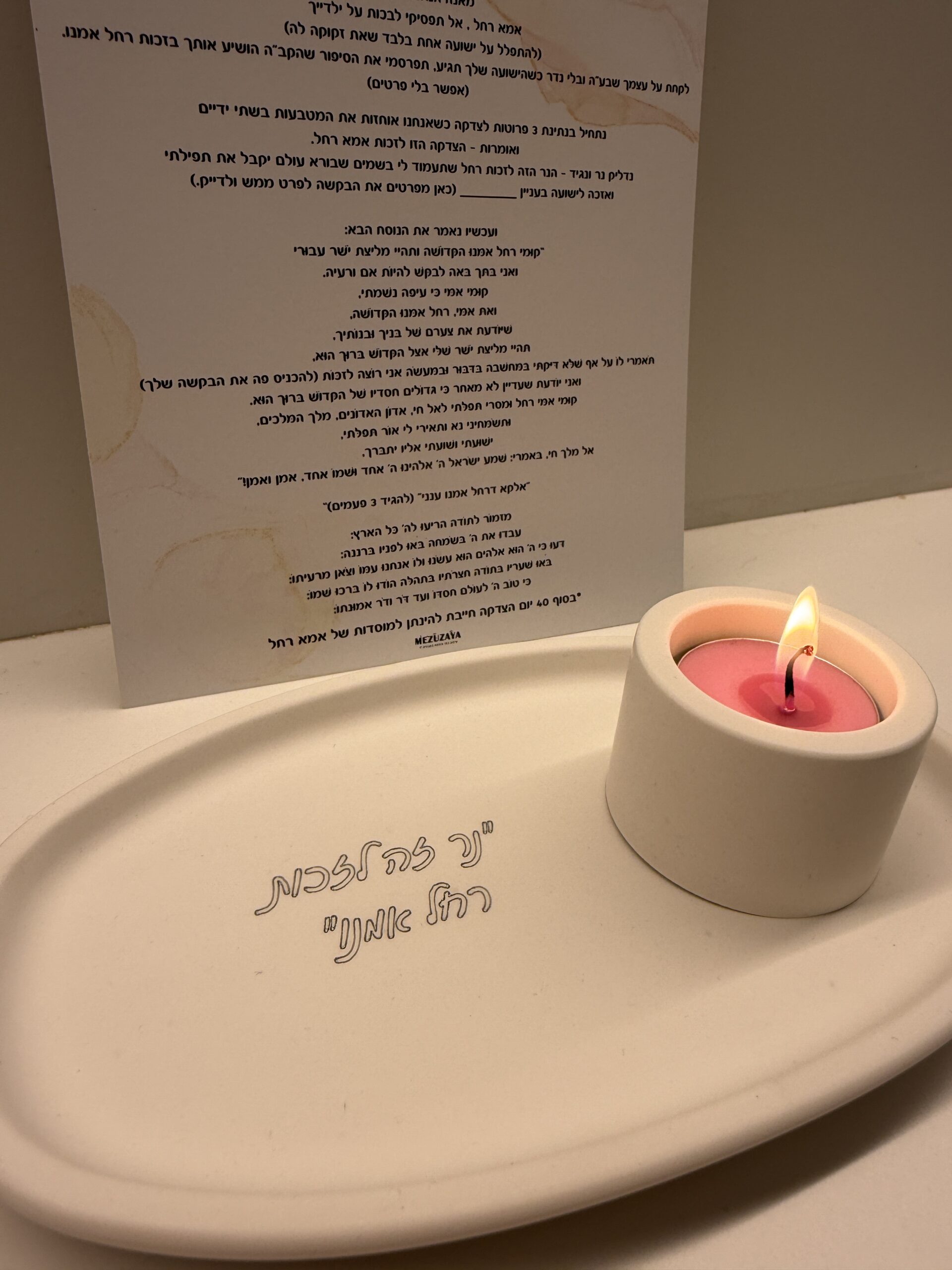מגיע עם מגש ופמוט מבטון בעבודת יד , עם חריטת לייזר לזכות רחל אמנו