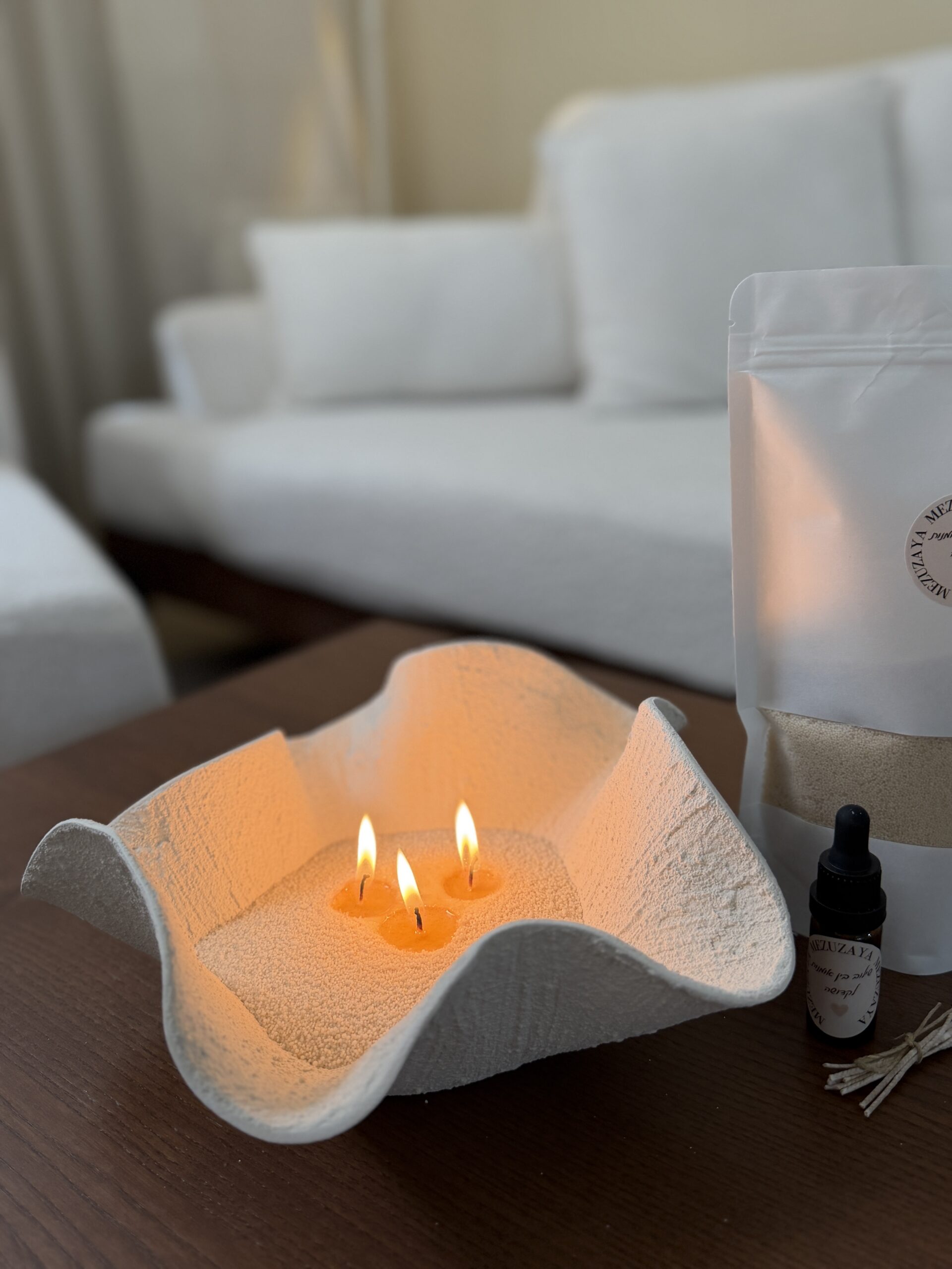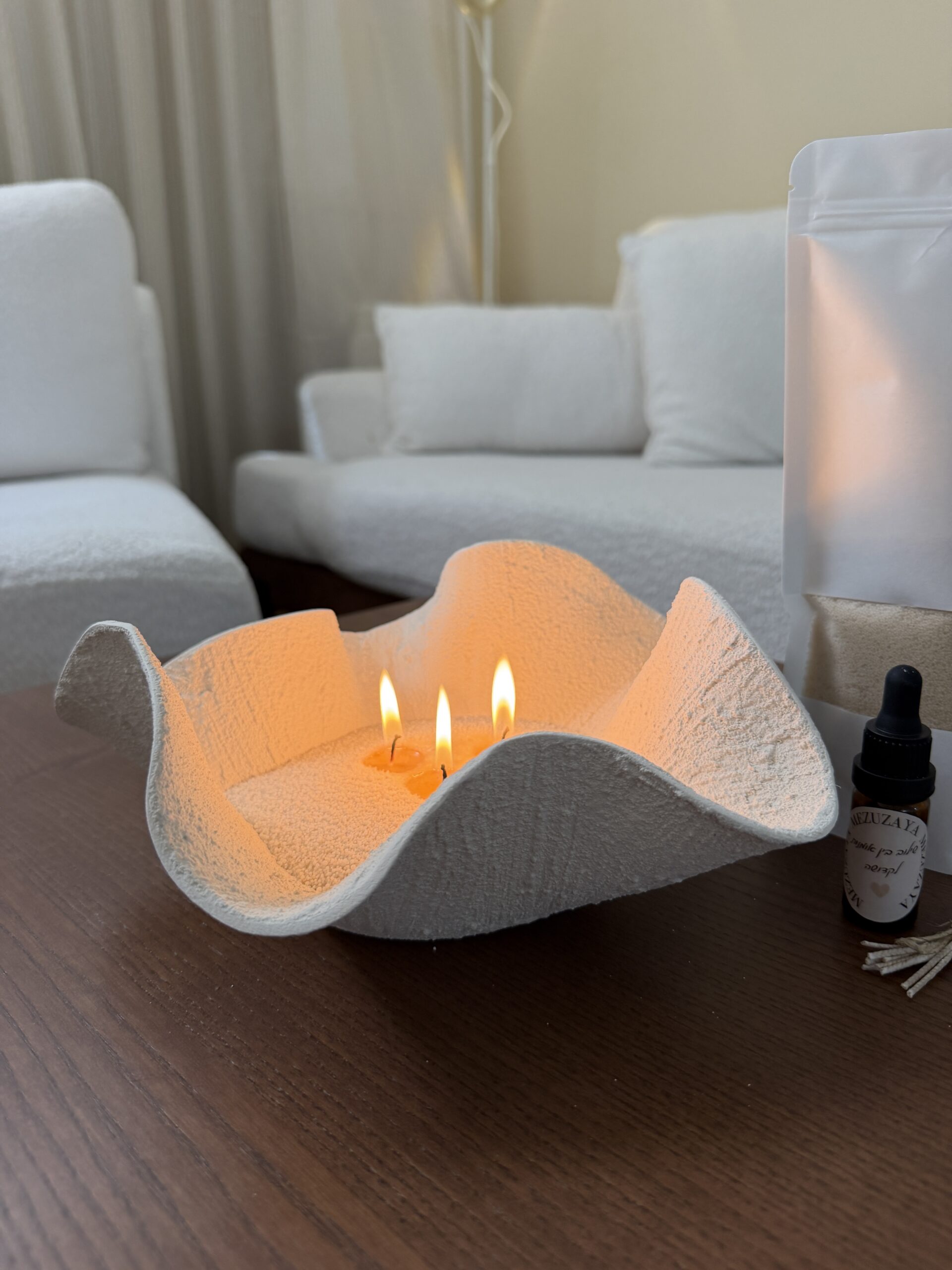 כלי לנרות בפיסול בעבודת יד מצופה בבטון בגוון אבן